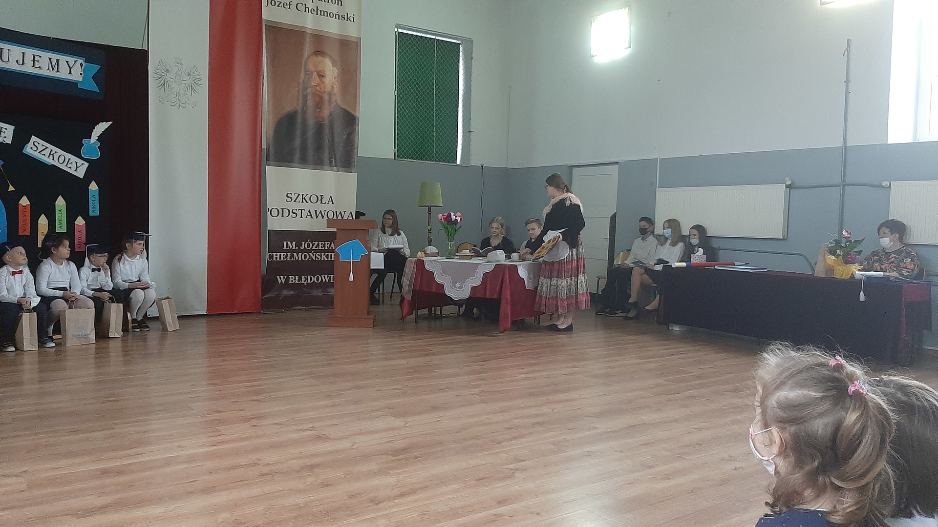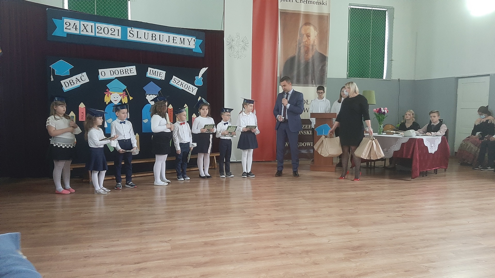 Oficjalną część spotkania poprzedził występ artystyczny pierwszaków. Dzieci zaprezentowały swoje umiejętności poprzez śpiew piosenek oraz recytacje wierszy. Pokazały, że już w tym wieku są dzielnymi patriotami naszej Ojczyzny, oraz że znają Patrona swojej szkoły.
