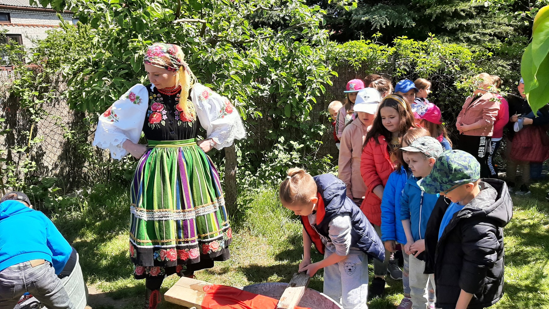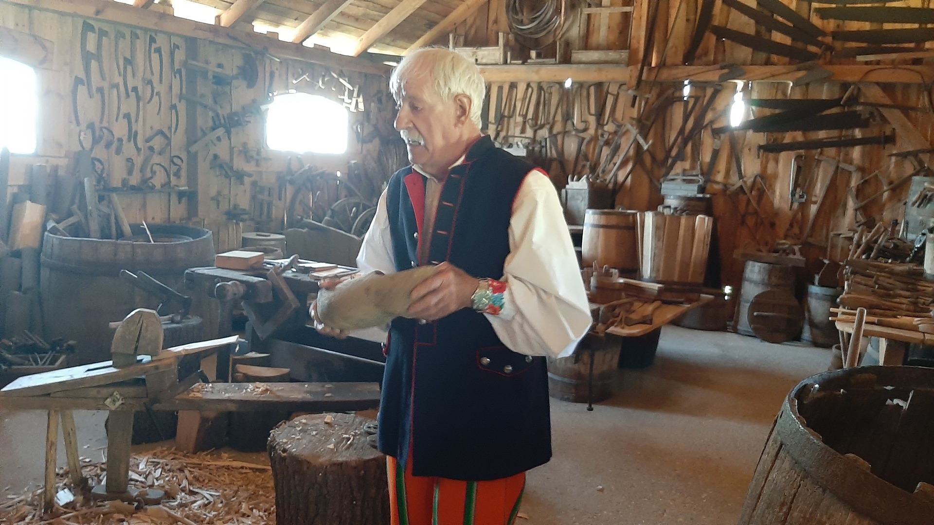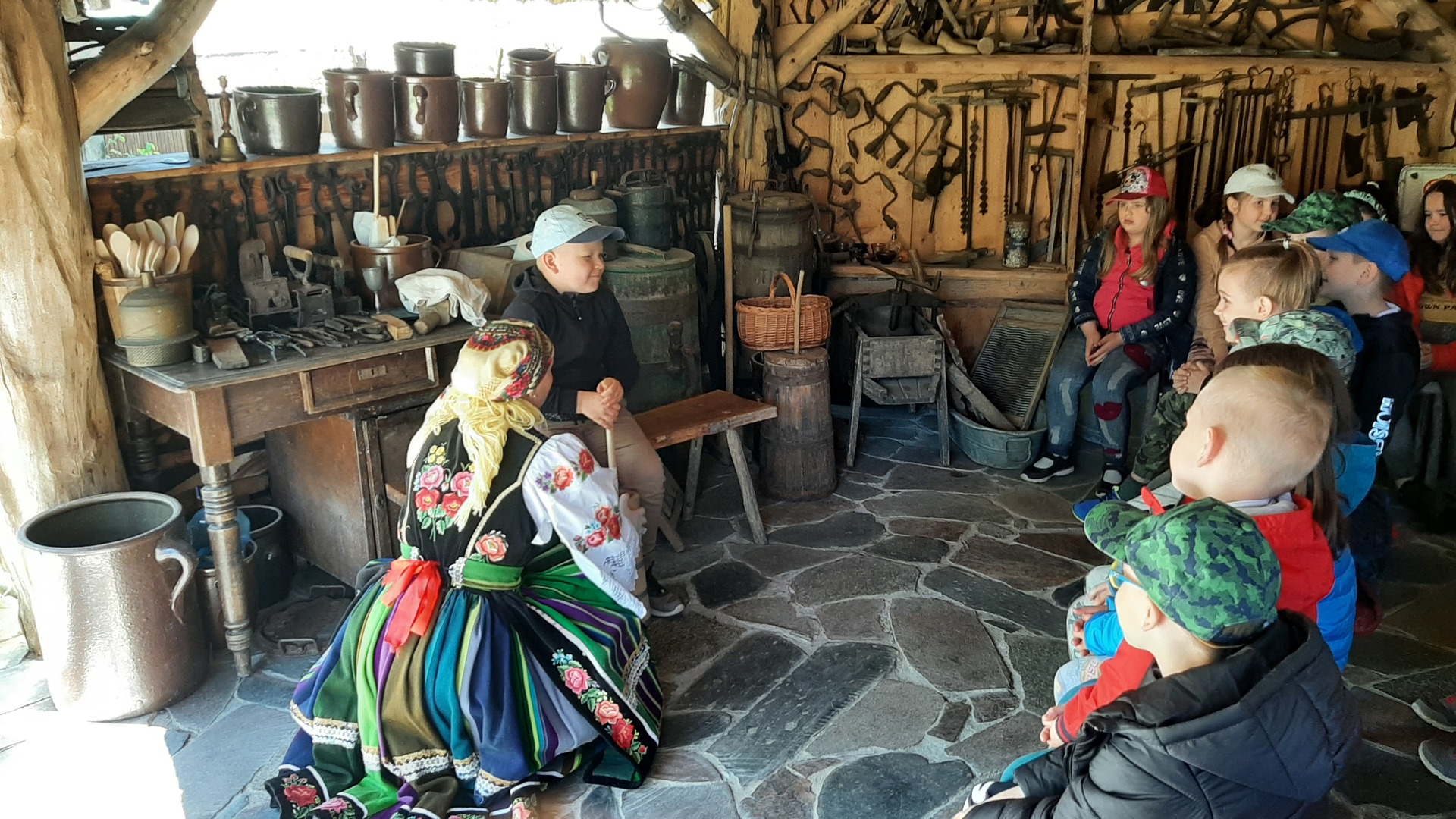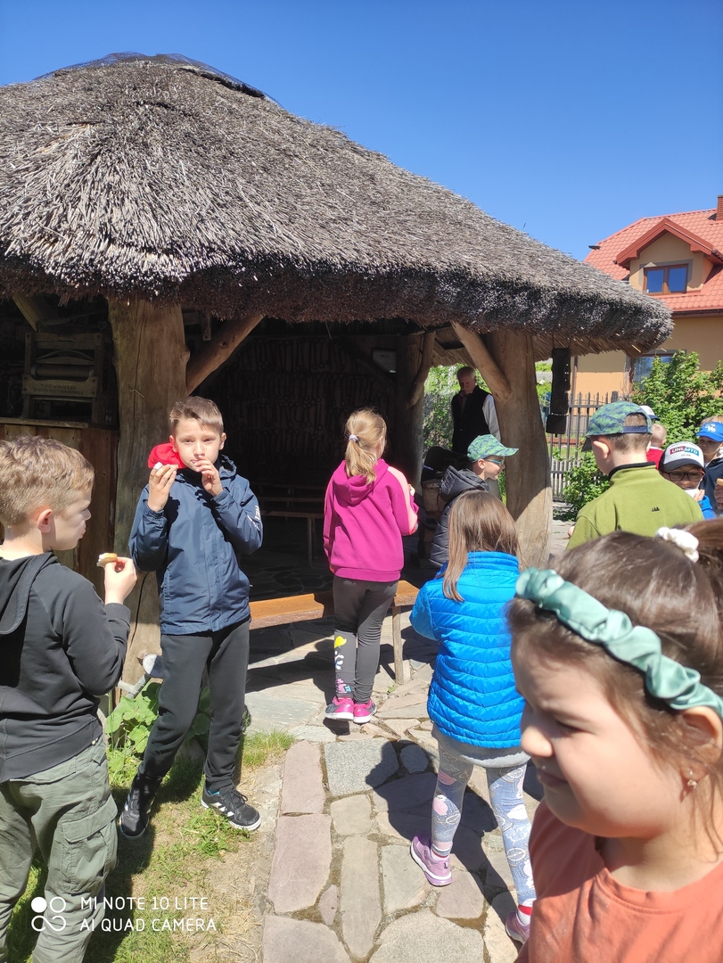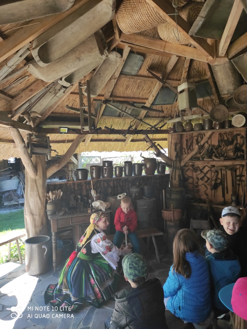 W zagrodzie bednarskiej zlokalizowanej we wsi Bednary dzieci obejrzały wiele ciekawych, charakterystycznych dla regionu eksponatów z dawnych lat. Uczestniczyły w pokazie wykonania łyżki drewnianej oraz innych wyrobów bednarstwa tradycyjnego. Poznały historię powstawania lodów i zobaczyły urządzenie do ich produkcji sprzed 150 lat. Obejrzały pokaz wykonania lizaków w dawnych formach rzemieślniczych i degustowały wykonane słodycze. Samodzielnie wykonały zabawkę z sitowia.