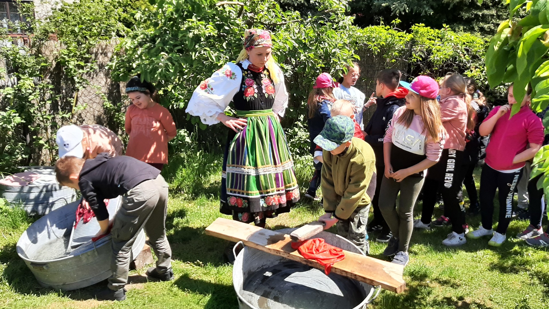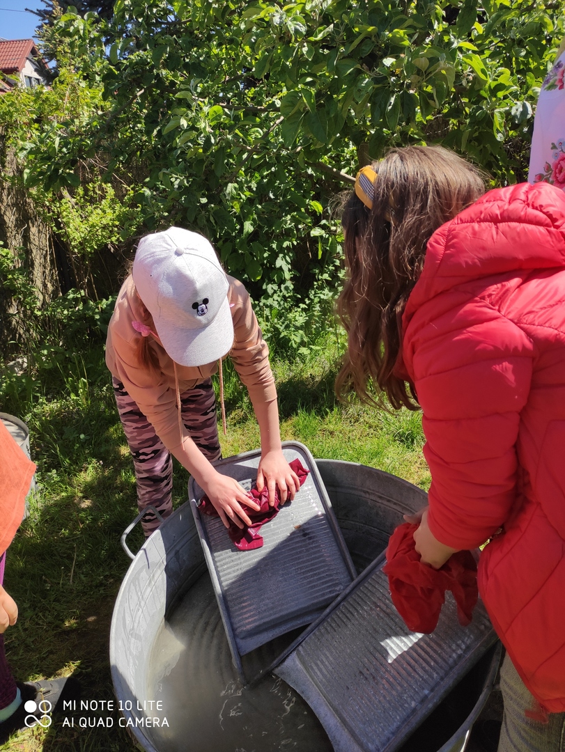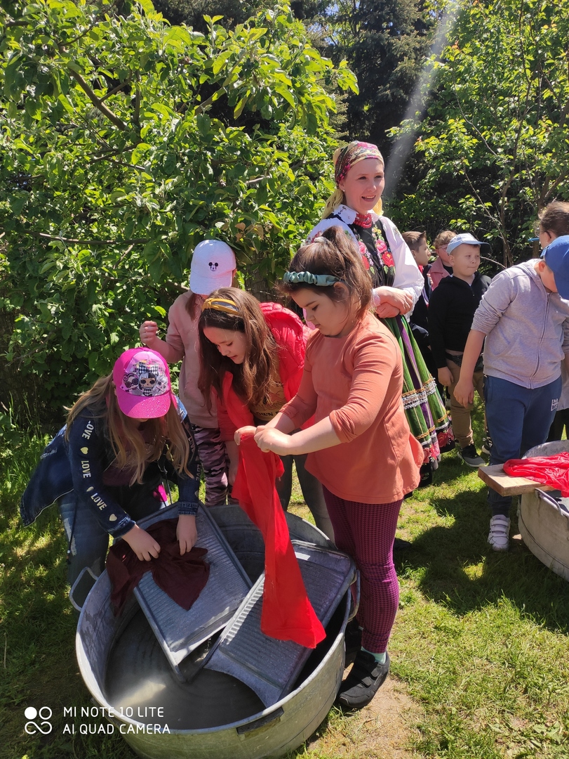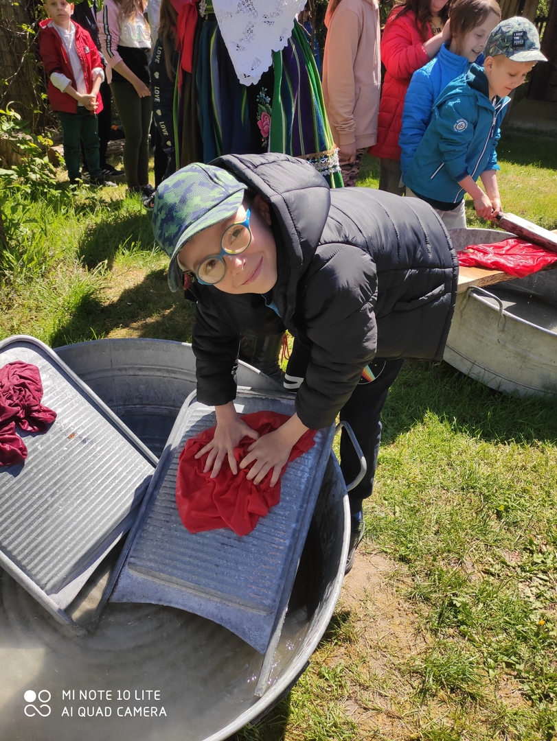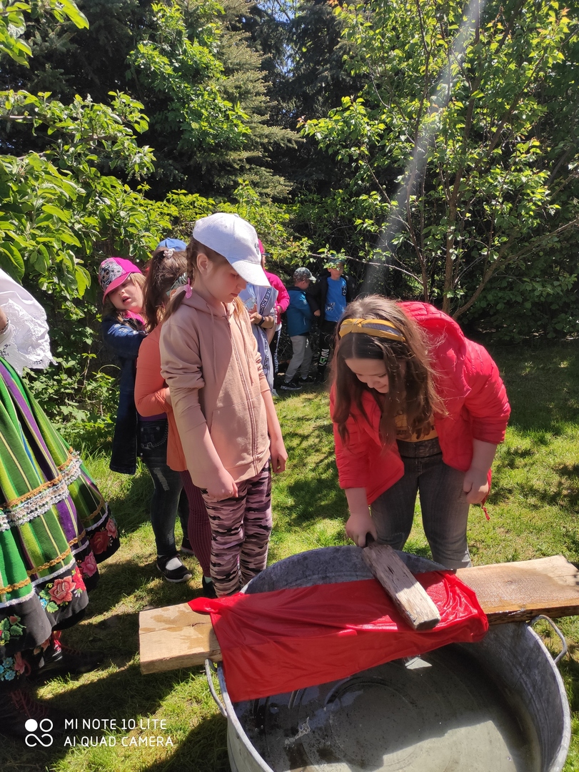 Dzieci miały możliwość poznać sposób prania odzieży w dawnych czasach. Chętnie wypróbowywały posługiwanie się kijanką oraz tarą:) Ta część warsztatów o wsi łowickiej, podobnie jak i wcześniejsze aktywności, bardzo się wszystkim spodobała.